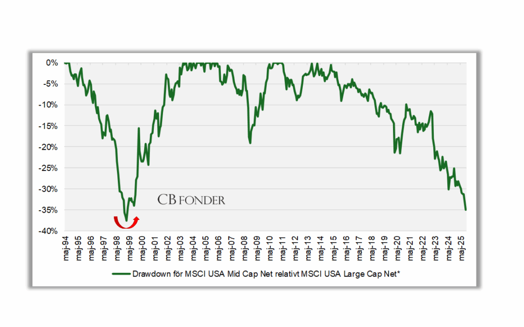Grafen visar drawdown för MSCI USA Mid Cap Net relativt MSCI USA Large Cap Net (i mångt och mycket Magnificent 7). Aldrig tidigare (med data sedan 1994) har MSCI USA Mid Cap Net haft en så lång period av underavkastning mot MSCI USA Large Cap Net som den nuvarande (cirka 12 år).