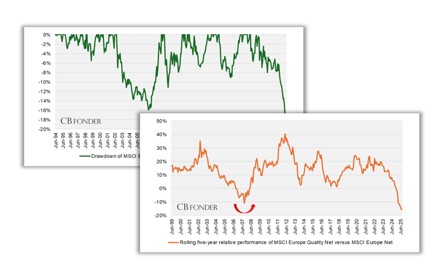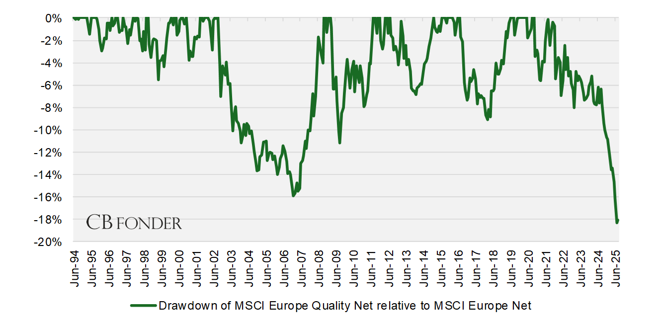 The first chart below shows the drawdown of MSCI Europe Quality Net relative to MSCI Europe Net. Never before has Quality (stocks with low leverage, stable earnings and high profitability) underperformed to this extent.