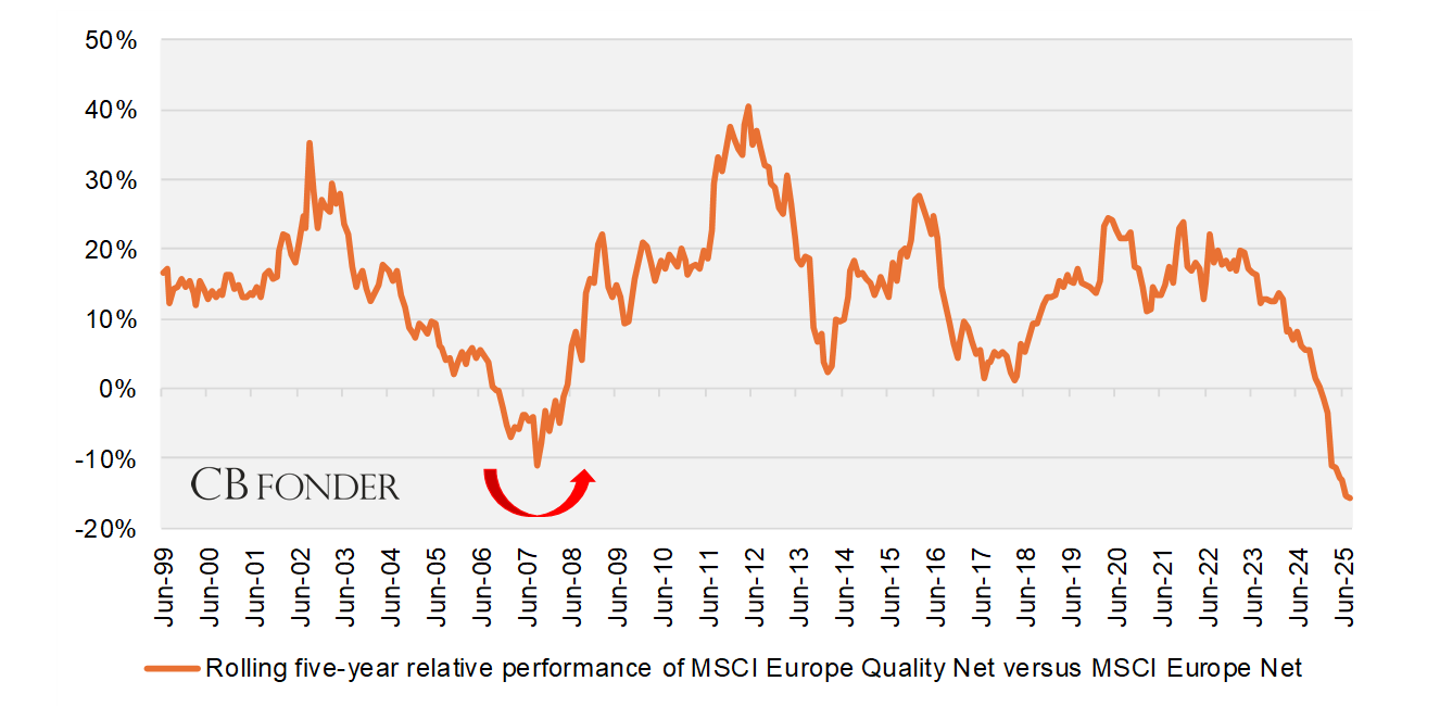The second chart shows the rolling five-year relative performance of MSCI Europe Quality Net versus MSCI Europe Net. Never before has Quality underperformed this much over a five-year period. The last time Quality recorded a five-year underperformance of -10% (in 2007, indicated by the red arrow in the chart), it was followed by outperformance of +8% over one year, +17% over three years, and +32% over five years. Today, the five-year underperformance is -16%.