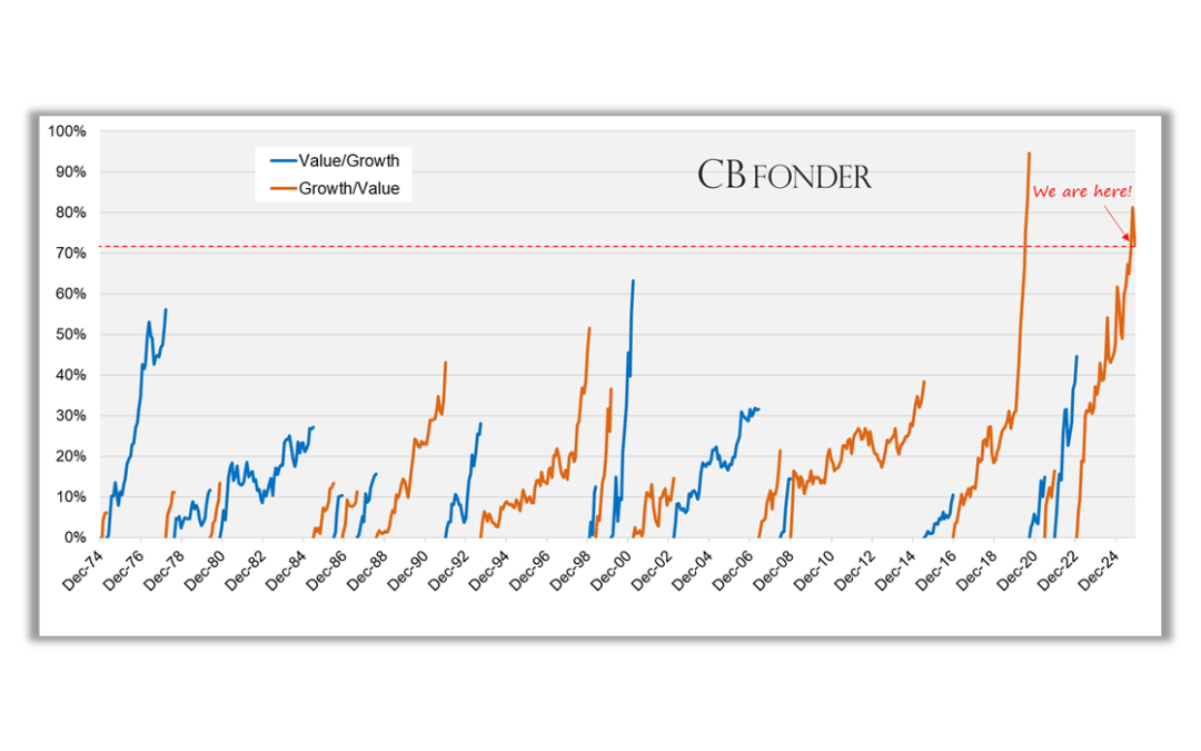 The chart illustrates periods of outperformance for Growth stocks (orange lines), largely driven by the “Mag 7”, versus Value stocks (blue lines) in the US.