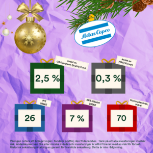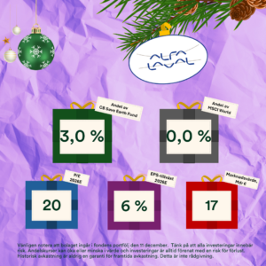 Detta meddelande ska inte betraktas som finansiell rekommendation, men som marknadsföring. Tänk på att alla investeringar innebär risk. Andelskurser kan öka eller minska i värde och investeringar är alltid förenat med en risk för förlust. Historisk avkastning är aldrig en garanti för framtida avkastning. Vänligen notera att bolagen ingår i respektive fonds portfölj den 11 december. Bolagen kan i teorin lämnat portföljerna vid tidpunkten för publicering av den aktuella luckan.