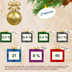 Under lucka 18 hittar vi Holcim, innehav i både CB European Quality Fund och CB Save Earth Fund, samt Ferguson, innehav i CB Save Earth Fund.