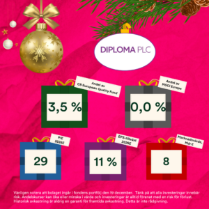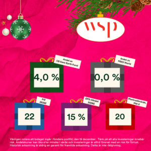 Detta meddelande ska inte betraktas som finansiell rekommendation, men som marknadsföring. Tänk på att alla investeringar innebär risk. Andelskurser kan öka eller minska i värde och investeringar är alltid förenat med en risk för förlust. Historisk avkastning är aldrig en garanti för framtida avkastning. Vänligen notera att bolagen ingår i respektive fonds portfölj den 19 dec. Bolagen kan i teorin lämnat portföljerna vid tidpunkten för publicering av den aktuella luckan.