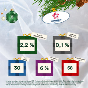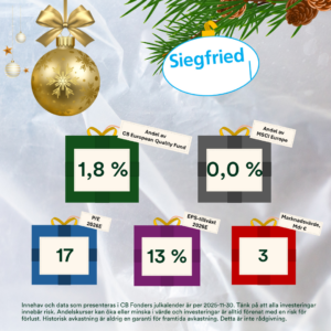 Innehav och data som presenteras i CB Fonders julkalender är per 2025-11-30. Tänk på att alla investeringar innebär risk. Andelskurser kan öka eller minska i värde och investeringar är alltid förenat med en risk för förlust. Historisk avkastning är aldrig en garanti för framtida avkastning. Detta är inte rådgivning.